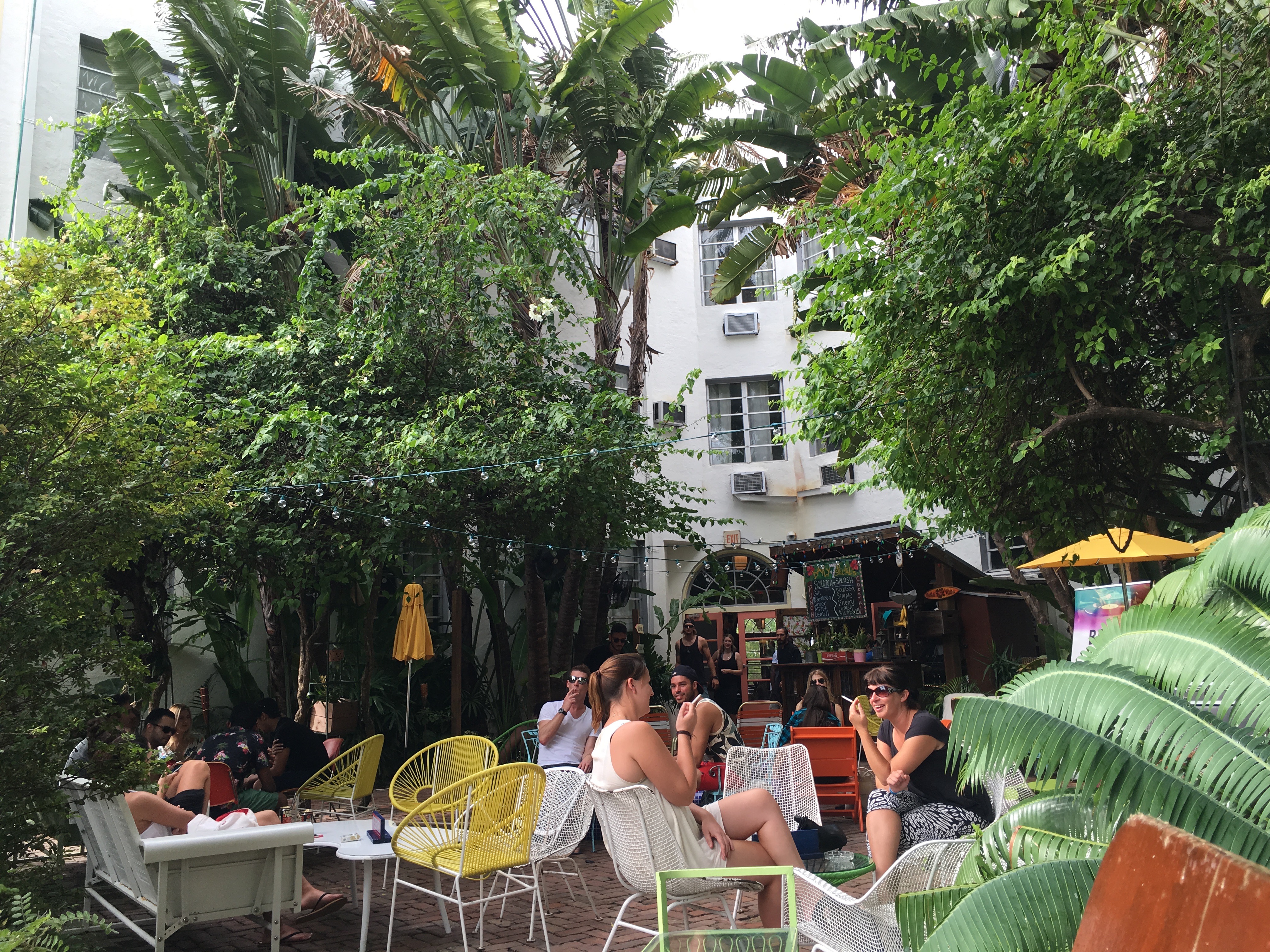 Saturday was mostly pool. The weather was finicky, first hot and balmy and then raining. When the rain shooed us from the pool, we took a free “house ride” in the hotel’s Tesla to the Broken Shaker. This was the bar/pool scene at the Freehand Hostel. Because it is a hostel, it had this bohemian, hipster vibe: the Brooklyn/Silver Lake of South Beach.